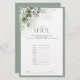モダンでエレガントな ブライダルシャワーゲーム「スパイスの名前は?」 豊かな灰緑色の植物の葉とユーカリを特徴とし、淡いユーカリの青灰緑色で縁取られています。 协调したスイートの一部です。 スイートを見る: https://www.zazzle.com/collections/elegant_eucalyptus_green_botanical_bridal_shower-119330045467288535 デザイナーに問い合わせて、商品を合わせてください。 エレガントインビテス アナスタシア・サリッジ 著作権を保有。すべての権利を予約します。