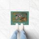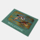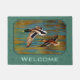 近くの紅葉から秋の色を反映した池の上にマガモが飛んでいる。海の霧の青と緑の背景にアクセントパターン(の模様が)ある。