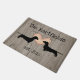 ダックスフントをテーマにした、粗野な木の板のような見た目のドアマットで、2つの黒いダックスフントのシルエットが田舎の水玉模様ハートに映し出されました。 黒い文字をニーズに合わせてカスタマイズ