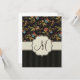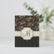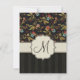東欧風の赤と青の花と緑と茶色の葉が茶色がかった黒の背景に咲き誇る花柄を上に、底部にデジタルデザインの黒地に黒のダメージ加工のストライプ模様を重ね、リボンとカスタマイズ可能なイニシャルシールがオーバーレイされたデザイン