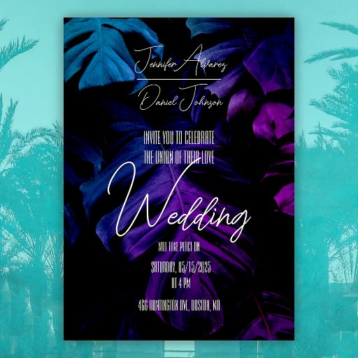 暗結婚色の熱帯植物モンステ葉ラ植物と美しい反応のカード。このジャングルの美学は夏や目的地の結婚結婚式イベントに最適だ。この結婚式のRSVPカードをマッシックな結婚式招待状スイートで完成させる。