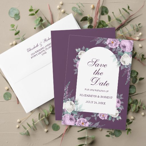 白と紫の結婚水救色の牡丹、ラベンダー、幾何学的な形状、タイポグラフィを備えたダークパープルの最新のカード。屋外に最適結婚。Lavender Purpleコレクションで一致する項目を結婚検索する。印刷可能なファイルがある。
