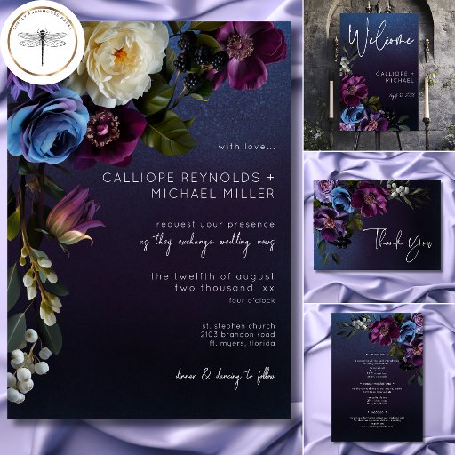 Dark Moody Blue & Lavender Floral Modern Weddingデザイン: Kathe Santillo