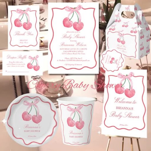 チェリーピンクのボウコケッタファンシーな女の子のベイビーシャワー招待状 編集可能なテンプレート 瞬時デジタルダウンロード, かわいいチェリーにリボンボーダーのベイビーシャワー招待カード チェリーベイビーシャワー招待状 夏のフルーツベイビーシャワー招待状
