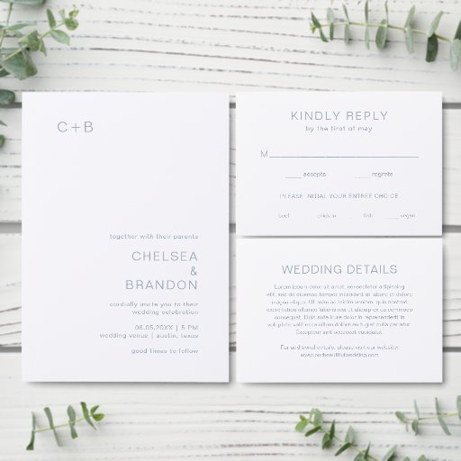 結婚式招待状モダンは上角にモノグラムをシンプル置き、右下角に離れ詳細を置いたミニマルなレイアウトとミニマリストのレイアウトを備えた結婚。背中に写真がお気に入りのある。すべてのデザイン要素は埃の多い青で、デザイン編集ツールで変更できる。まだミニマルデザインのコンテンポラリーこの結婚式招待状はエレガント、のスタイルと上手く結婚行く。