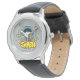 チビ(小さくかわいく書いた感じ)すごい男がレンガの壁を突き抜ける 腕時計