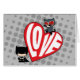 チビ(小さくかわいく書いた感じ)のキャットウーマンがチビ(小さくかわいく書いた感じ)バットマンに飛び掛かる可愛らしいグラフィックで、巨大な赤いハートに「愛」という言葉が登場。
