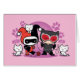 チビ(小さくかわいく書いた感じ)のキャットウーマン遊の3匹の白い子猫とチビ(小さくかわいく書いた感じ)のハーレー・クインが彼女のそばでイライラして待っている。