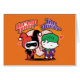 チェックアウトチビ(小さくかわいく書いた感じ)ジョーカーはチビ(小さくかわいく書いた感じ)ハーレー・クインをハート遊のカードと共に提示し書、その名前は背景に巨大な水玉模様ハートの上に。