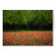 美しいコントラストの自然。オレゴン州ウッドバーンにある木靴チューリップファームで開花いっぱいのサンゴのチューリップを背景に緑豊かな木々の列。美しい春の朝!写真は2014年4月。