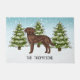可愛いチョコレートブラウンオリジナルレトリバーのデステイのラブラドール漫画イラストレーションは犬を繁殖。3本の緑のモミの木と降り積もる雪が積もった冬のシーンに犬を置く。背景は青から白のグラデーション与えのデザインは、寒い冬の日に見える。名前にはパーソナル化可能な文字領域もある。
