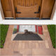 チョコレートラブラドールレトリバー犬は、ポットと植物と白いフロントドアでドアマットマットの上に。