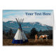 太平洋北西部のティピの近くに先住民のアメリカ人とその馬のイメージ。背景の山々の高斜面に雪が定着している。独自の文字を追加