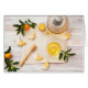 蝶が付いている緑茶、蜂蜜、蜂蜜のスプーン、キンカンおよびクッキーが付いているガラスティーポットそしてティーカップはティータイムの準備ができたteatowelに形づきます。