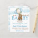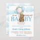 テディベア赤ちゃんシャワーはバルーン予算の招待状テンプレートと可愛いテディベアを待つ初めて、ジャケットのテディと風船の束と雲の青と茶色の消色のズボンのズボン。