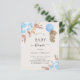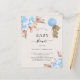 ボホモダンスタイルの赤ちゃんシャワー。ホワイト背景.薄飾い青い花模様とバラとパンパスグラスと青い気球を持つテディベアの少年と。名前とパーティー・詳細のパーソナライズおよび追加1枚= 1枚の招待状を印刷したエッジからエッジ