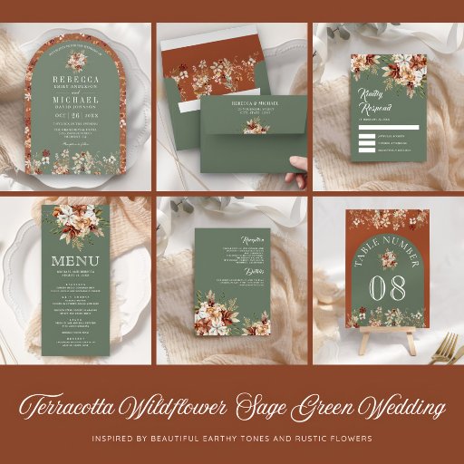 テラコッタワイルドフラワーセージ緑結婚アーチ 招待状