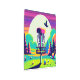 紫色、緑、青、オレンジの木々の夕日の中にディスクゴルフピンを描いた8ビットピクセルアート。