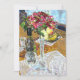 ワイングラスとワインのボトルと花が花瓶に入ったテーブル