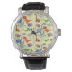 ディノ世界壁時計のデザインは可愛い恐竜、火山やヤシの木を含む。
