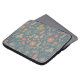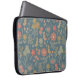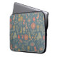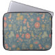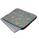 このラップトップスリーブは、デニムブルーの背景にサンゴ色とオリーブグリーン色の色合いで様式化された花を特徴としている。