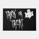 NewParkLane – 黒と白のハロウィーンのイラストレーションで、不気味なハロウィーンタイポグラフィに「トリックまたはトリート」引用文を持ち、黒い背景に対して怖い白い幽霊のシルエット装飾を。背景色を任意の色に変更できる…このハロウィーンコレクションで一致するアイテムを確認する。具体的な個人的なデザインの願い?感じお連絡楽に!