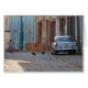 玉石のクラシックな車そしてある鶏はキューバの通りに投石します