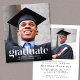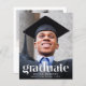 トレンディーの大きな白フレンドリー文字の「卒業生」と、その名前、学校とクラスの年を含むタイポグラフィの白でオーバーレイされた、あなたの卒業写真を特徴とする予算卒業発表とパーティの招待状シンプル。背面に、追加の写真とグラードパーティー詳細を追加。