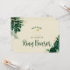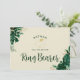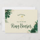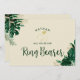 トロピカルな葉のモダンなグリーンとリーフのボーダー リングベアーにお願いします 提案カード トロピカルテーマのウェディングステーショナリーに最適。リッチなグリーン、エメラルド、ゴールドの箔押しを使用した大胆なカラーパレット。ビーチ、デスティネーション、サマーウェディングに最適なデザイン。トロピカルの楽園のような気分を醸し出す、鮮やかなヤシの葉のデザインは、ビーチやトロピカルなウェディング会場にマッチします。ダークグリーン、ターコイズ、エメラルド、グリーン、ゴールドのカラースキームで、リングベアーにお願いします 提案カード。