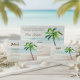 このトロピカルウェディングSave the Date招待は、パステルアクアブルーの背景にココナッツの中に水の色のピンクのハイビスカスの花とパームの葉の花束を備えている。裏面はブルー絵を描スの中で霜降りした質感。私のトロピカルパラダイスのコレクシ結婚ョンとコーディネート。
