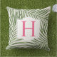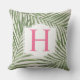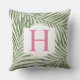 トロピカルスタイルピローデザインは、繊細なリネンのスタイル背景を持つ層状の葉の緑のヤシの葉パターンを特徴とする。白い装飾枠には明るいピンク色のモノグラム文字が付いていまカスタマイズす。姓のイニシャルでパーソナライズできる。