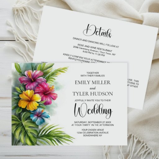 このトロピカルフラワーとグリーンのウェディング招待状で、友人や愛する人たちをあなたの結婚式に招待しましょう。 カスタマイズ可能なテキストを使用すると、新婦と新郎の名前、結婚式の日付、祝賀会の必要な詳細を簡単に追加できます。 ユニークな招待状のためのさまざまな紙の種類とコーナースタイルが利用可能で、デジタルフォーマットを好む場合はダウンロードオプションもあります。