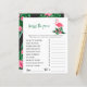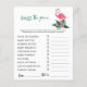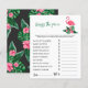 赤ちゃんシャワー招待デザインは、緑豊かな緑のヤシの葉の葉の葉と熱帯ハイビスカスの花とピンクのフラミンゴを特徴とする。「アロハベビー」。黒い背景色のトロピカルフローラルパターンがカードの背面に着く。