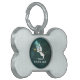 この骨の形をしたペット識別タグには、かわいい漫画のお化けが、青いトップハットをかぶり、ドクロのついた黒い杖を持って、星のきらきら光る暗い夜空に浮かんでいる。名前と電話番号をテンプレートでカスタマイズ。