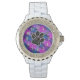 この時計は愛犬家にぴったりだ。明るい背景は、どの服にも色のダッシュを追加する。この時計の中心には大きな黒い前足のプリントが飾られ、青と紫ストライプのの対角線の背景に設定されている。
