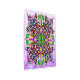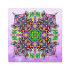 カラフルかわいらしの花やで構成されたトンボの曼荼羅を描いた葉作品。紫、緑、黄色、青の明るい美しい色。