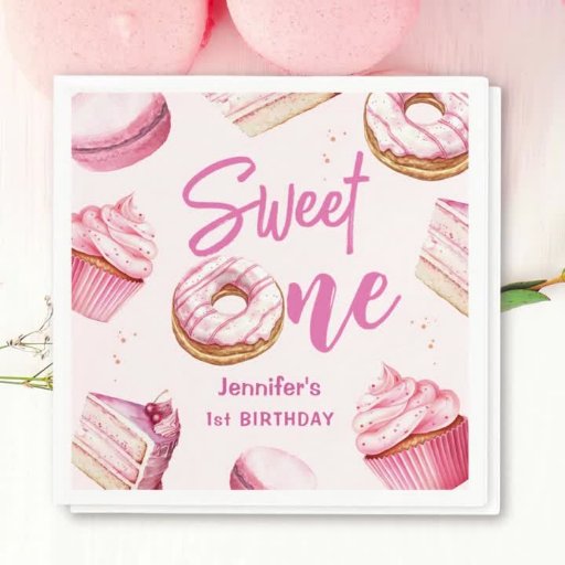 お祝いの甘さを楽しめる「ドナッツピンクの女の子スウィートワンの誕生日パーティの招待状!」 特別な日におもしろいを振りかけるにはぴったりだ。今すぐ注文して甘いお祭りを始めよう!🎉🎂