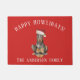 DobermanDogを特徴とする愛らしいクリスマスのdoormatフェスティバルの赤い背景にサンタハットを着ている。
