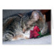 赤いバラに寄り掛かった顔で寝ている雑種のタビー猫。空白のインテリア。