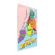 ニューヨークシティの様式化された地図描写、漫画本のスタイル。5つの区画は黒い線で輪郭を描はっきりしたき鮮やか、色で満たされている:マンハッタン(赤)、ブルックリン(黄色)、クイーンズ(オレンジ)、ブロンクス(緑)、スタテン島(紫)。各区は白い箱に黒い輪郭のラベルが貼られている。