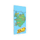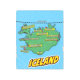 鮮やかなポップ・アートの青の背景とパターンを持つアイスランドのアートスタイルのマ点々のあるップ。地図自体は緑で黒い輪郭を持ち、赤い点と黄色の吹き出しでさまざまな都市や町を特徴としている。都市の名前は書吹き出しの中にはっきりした白い文字で書かれている。