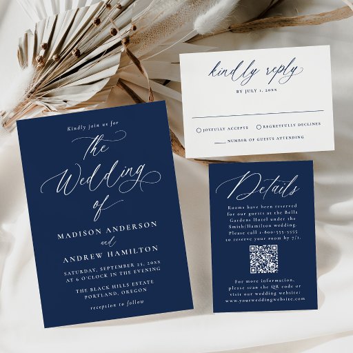 ネイビエレガントー書道結婚式の日付を保存 ベラム紙招待状