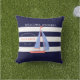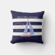 サンゴと青のストライプの帆船のイラストレーション、家族の名前と"Welcome Aboard"文字とネイビーブルーと白の屋外の枕。いくつかの文字は、スタンプを模倣するために非対称に配置される。このクッ航海のションテンプレートはパーソナライズとカスタマイズなる簡単で、ビーチハウスのポーチに最適。このボートテーマデザインは装飾用クッションでも利用可能であり、沿岸のリビングルームの装飾やベッドルームの装飾に適している。
