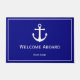 お客様のボートへようこそ。白いボートのいかりは文字の上にある。ボートの名前とメッセージは、いかりの下に追加できます。すべての文字は白で、編集または削除できます。マットはネイビーブルー。