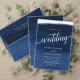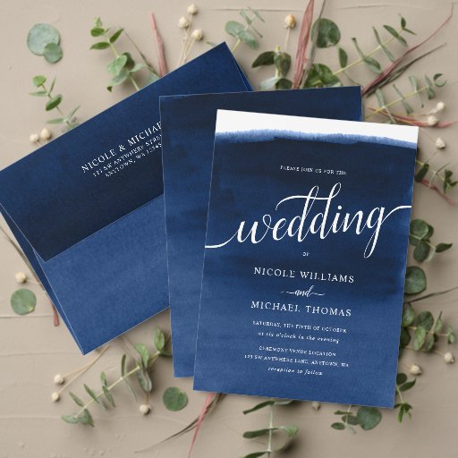 このネイビーはっきりしたブルーの結婚式招待状で声明をモダン作成する。このエレガントデザインは手の水の色の背景を備え絵を描て、スクリプトフォントとセリフタイポグラフィの組み合わせフォーマルを備えている。こもしのデザインは救済必要カスタマイズで、デザイ連絡ナーをお願い。喜んで救済!