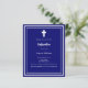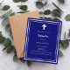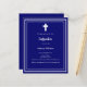白い枠と白いクロスを備えたネイビーブの青い背景をパーソナライズし、名前と詳細を追加する。白文字。1枚= 1枚の招待状を印刷したエッジからエッジ