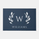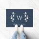 ネイビーブルーリースイニシャルモノグラム姓Doormatは、ネイビーブルーの背景に手描きの月桂冠を特徴とし、あなたの姓とイニシャル。