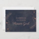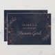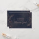 ネイビーブルーとローズゴールドの箔押し花の枠が付いたウェディングデザイン。手描きの花、葉、水彩の背景。秋や冬のウェディングにぴったりな、モダンでおしゃれな外観。ネイビーブルーとローズゴールドの偽の箔押しが目を引く。手描きの花の要素と、モダンでトレンディなスクリプトフォント。 - パーソナライズされたウェディングフラワーガール提案カード「私のフラワーガールになってくれる?」