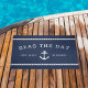 クラシックのネイビーの青い背景に白いレタリングにあなたの船の名前と船のレジストリを含むカスタムこののフォーマットであなたのボートのゲストを歓迎する。ホワイトロープトリムといかりイラストレーションを追加航海のしゃれているする。