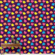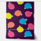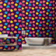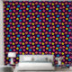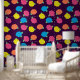 鮮やかなネオンピンク、ブルー、イエロー、サンゴにネオングリーンのバラを施した様式化したおもしろいは、深いの紫色の背景に波状に塗り葉て、の花柄を作り出す。
